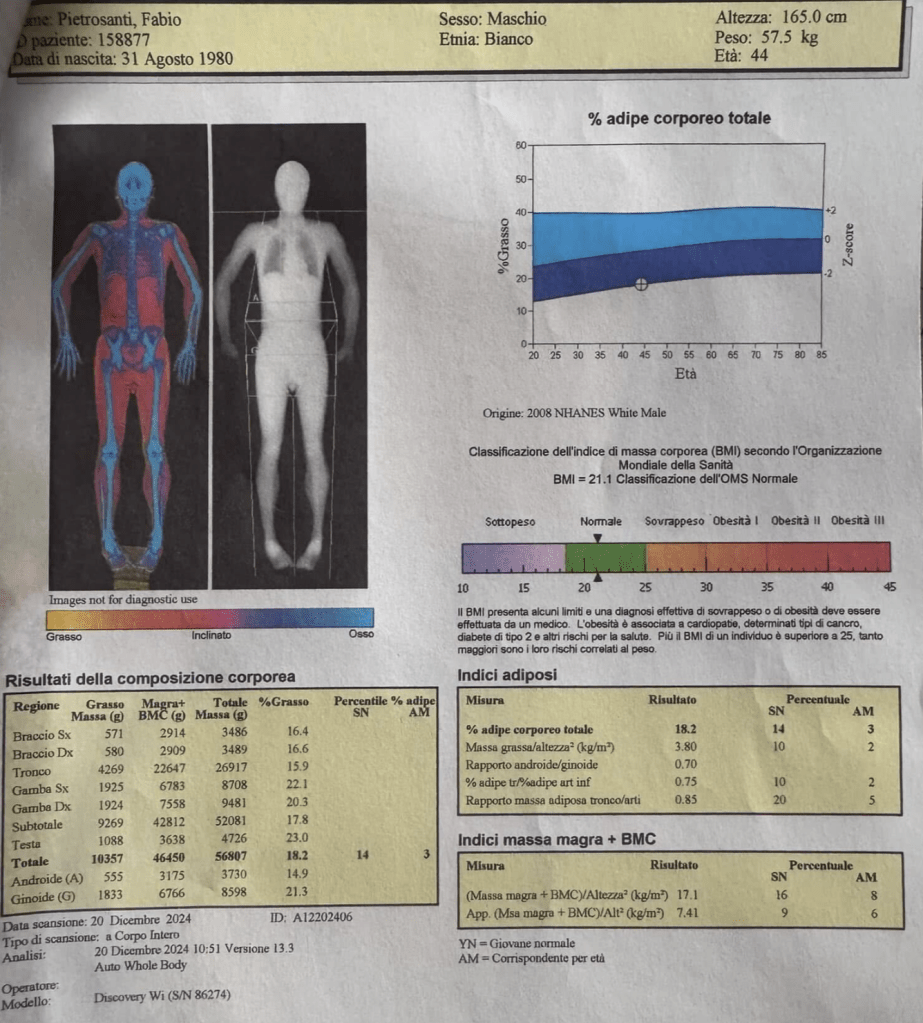 From here it’s pretty clear that i have some “bones fraility” (worth to check my vitamin D status in blood panel), that my body fat is still too high to be “fit” and that my left leg have +2% body fat that my right leg.
